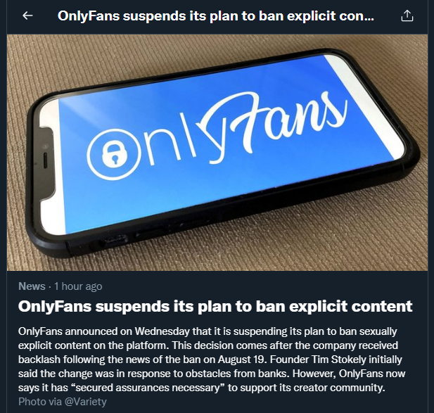 From the OnlyFans. 20 hours agoOnlyFans says it has suspended a plan to ban sexually explicit content following an outcry from its creators and advocates for sex workers. 17 hours agoOnlyFans issued a statement via its Twitter channel on Wednesday morning August 15 explaining why they reversed course on the controversial and financially impactful ban.